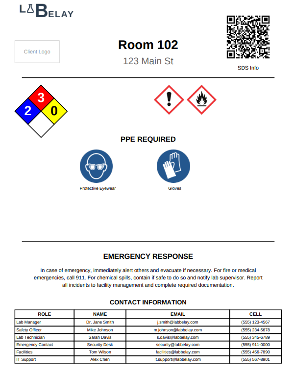 Have the hazards, communications, and all SDS sheets automatically maintained in each lab space to BSL-2 standards. Guide will automatically update the door and floor information sheets and provide QR codes that give PDF access to up-to-date chemical inventory to First responders.